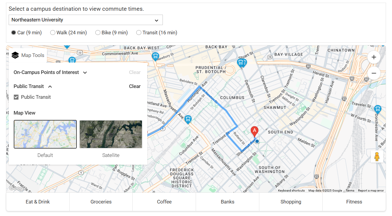View available public transit options on each apartment listing. To do this, select a listing, scroll down to the map, and select a campus from the dropdown options. Next, select Map Tools > Public Transit